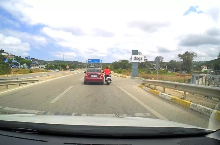 İstanbul'da bir motosiklet şoförü, seyir halindeki bir arabaya tutunarak yaptığı tehlikeli seyahat araç kamerasına...